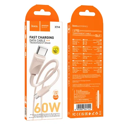Szybkoładujący kabel Hoco X114 ze złączem USB-C – USB-C o długoścu 1 metra. Umożliwia szybkie ładowanie z mocą do 60 W i transfer danych. Obsługuje protokół Power Delivery i Quick Charge 3.0.